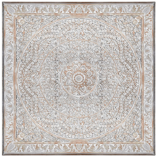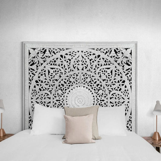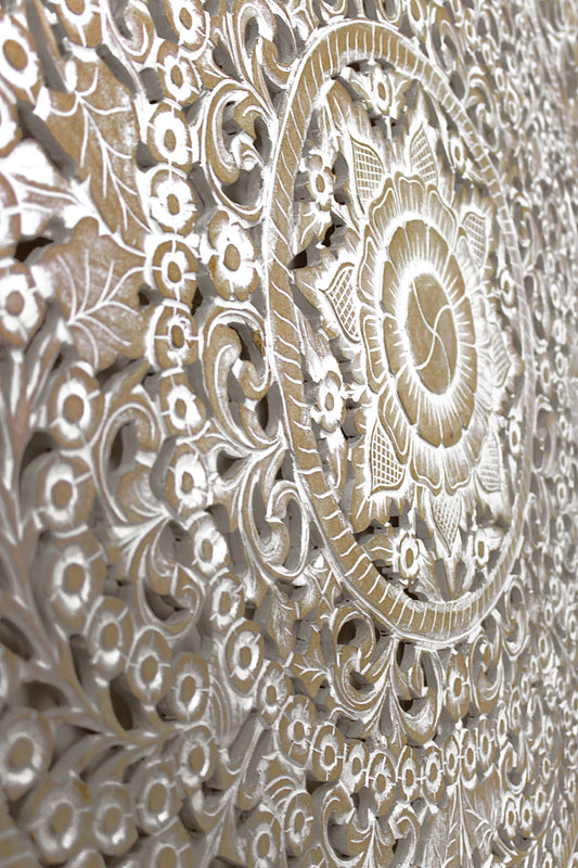 Hand Carved Queen Size Mandala Bed Headboard Umadewi 59" in White Wash | Hand Carved Wall Decor | Wood Wall Art | Boho Bed Headboard