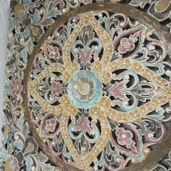 Thanks to the antic wash finish applied by our craftsman, the details on this large mandala will pop on your wall!