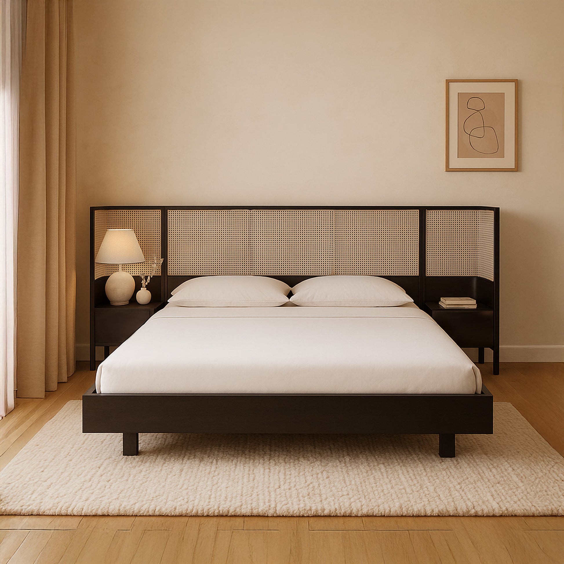 Give your bedroom a sophisticated centrepiece—the Cane Storage Bed provides both art and utility in any open bedroom space, offering an oversized headboard with built-in side tables. The wrap-around design of the bed's frame creates a cozy nook for restful sleep.